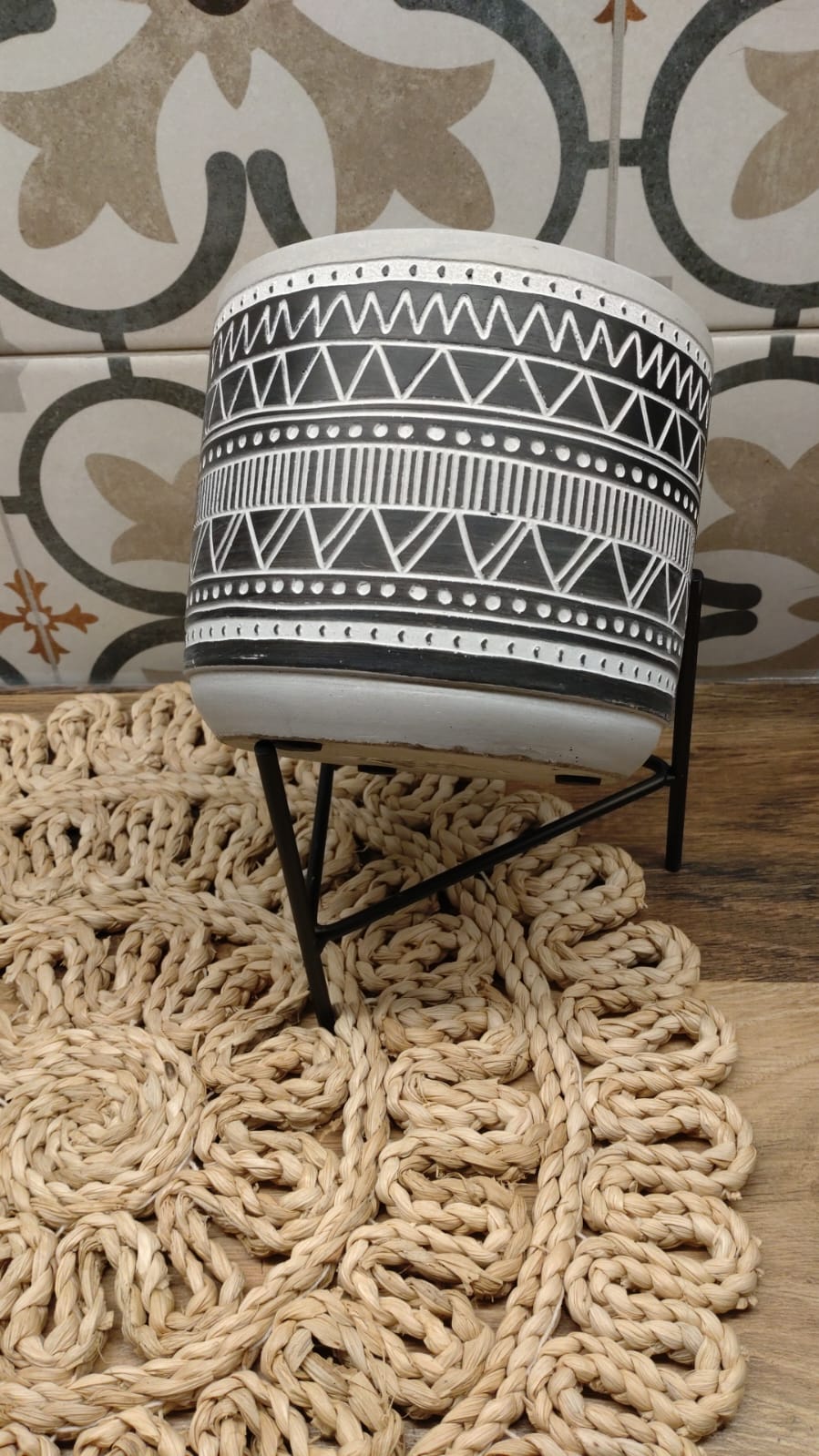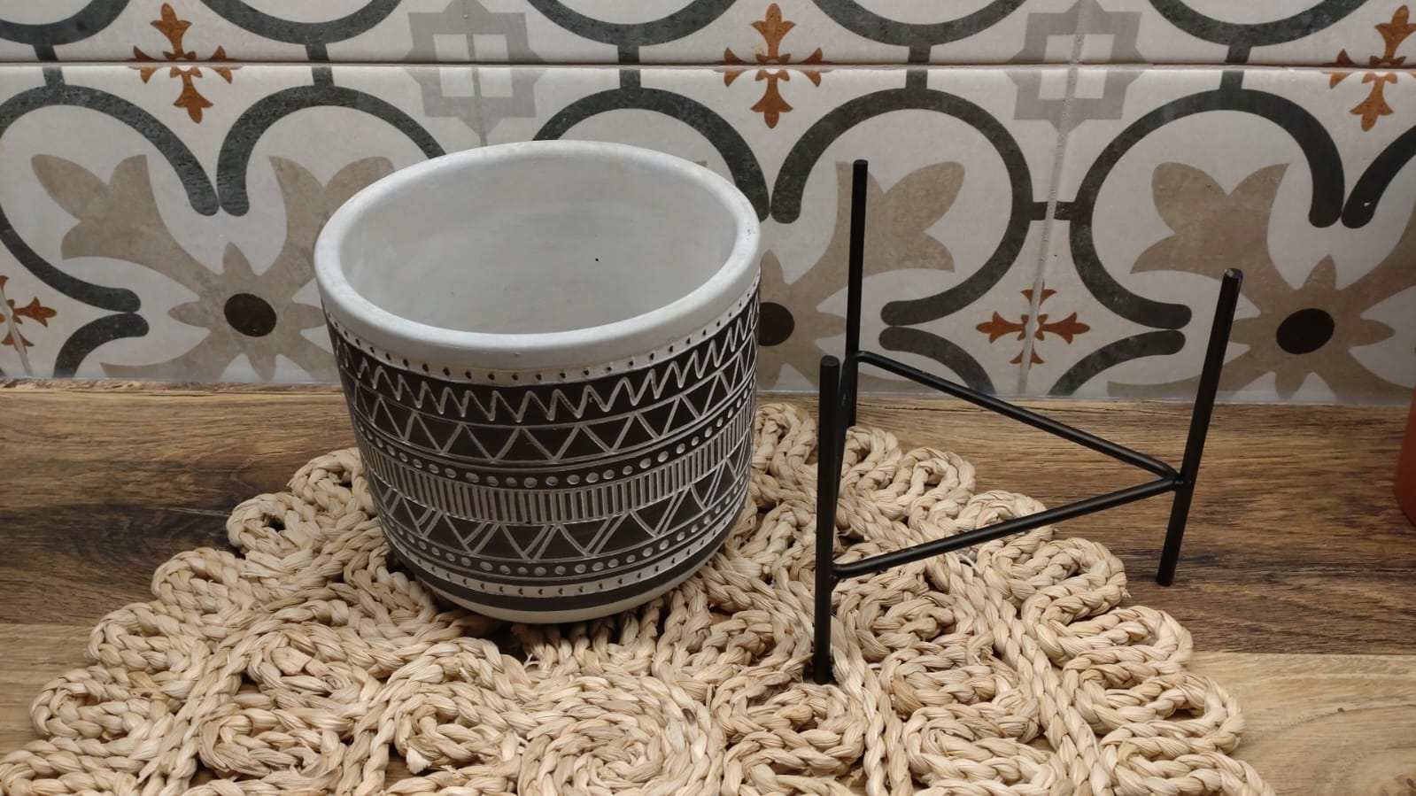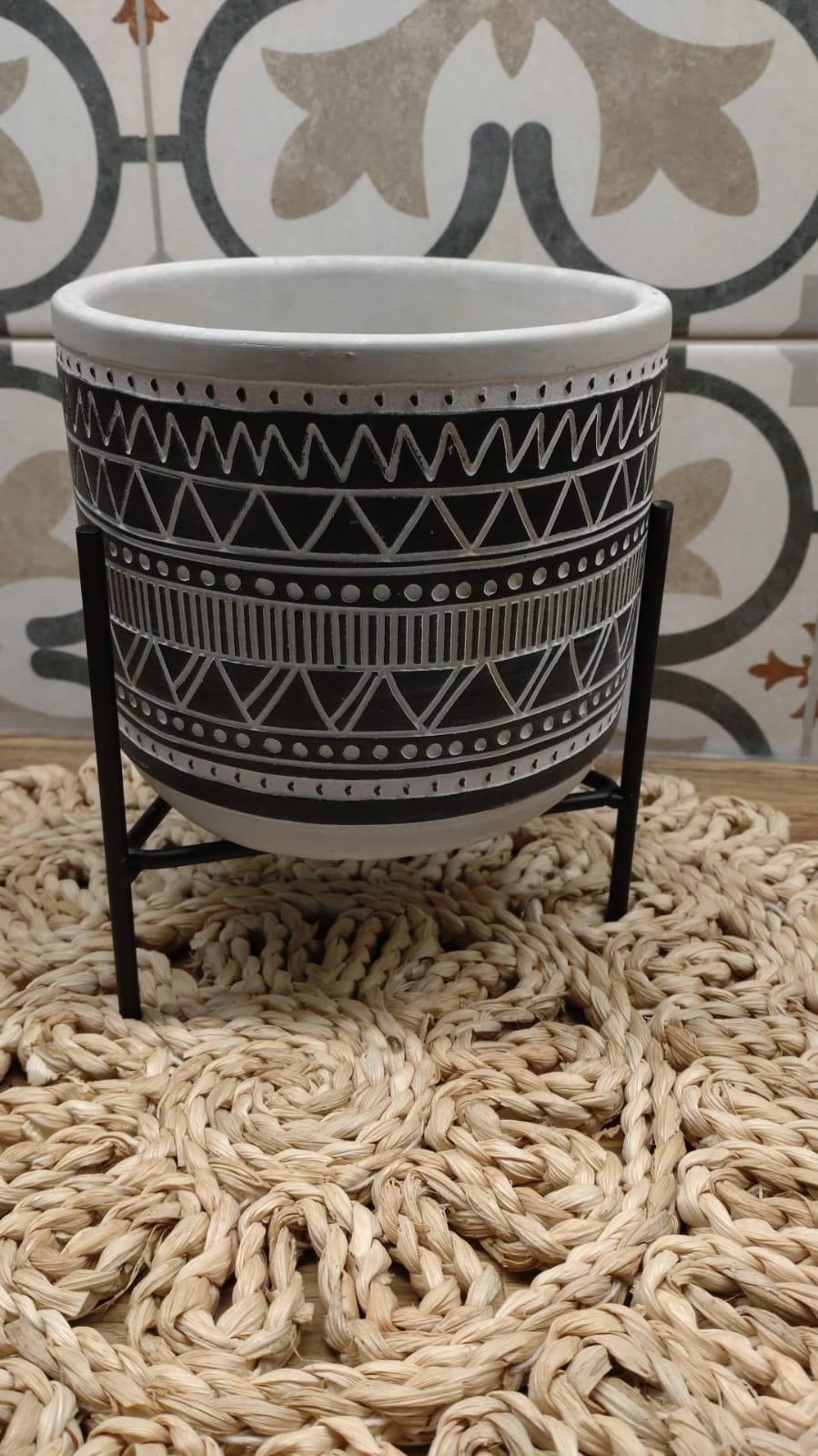 Hebe - betonový obal s antickým vzorem, na kovovém stojánku. Rozměr:14x12cm, velikost květináče: 12cm