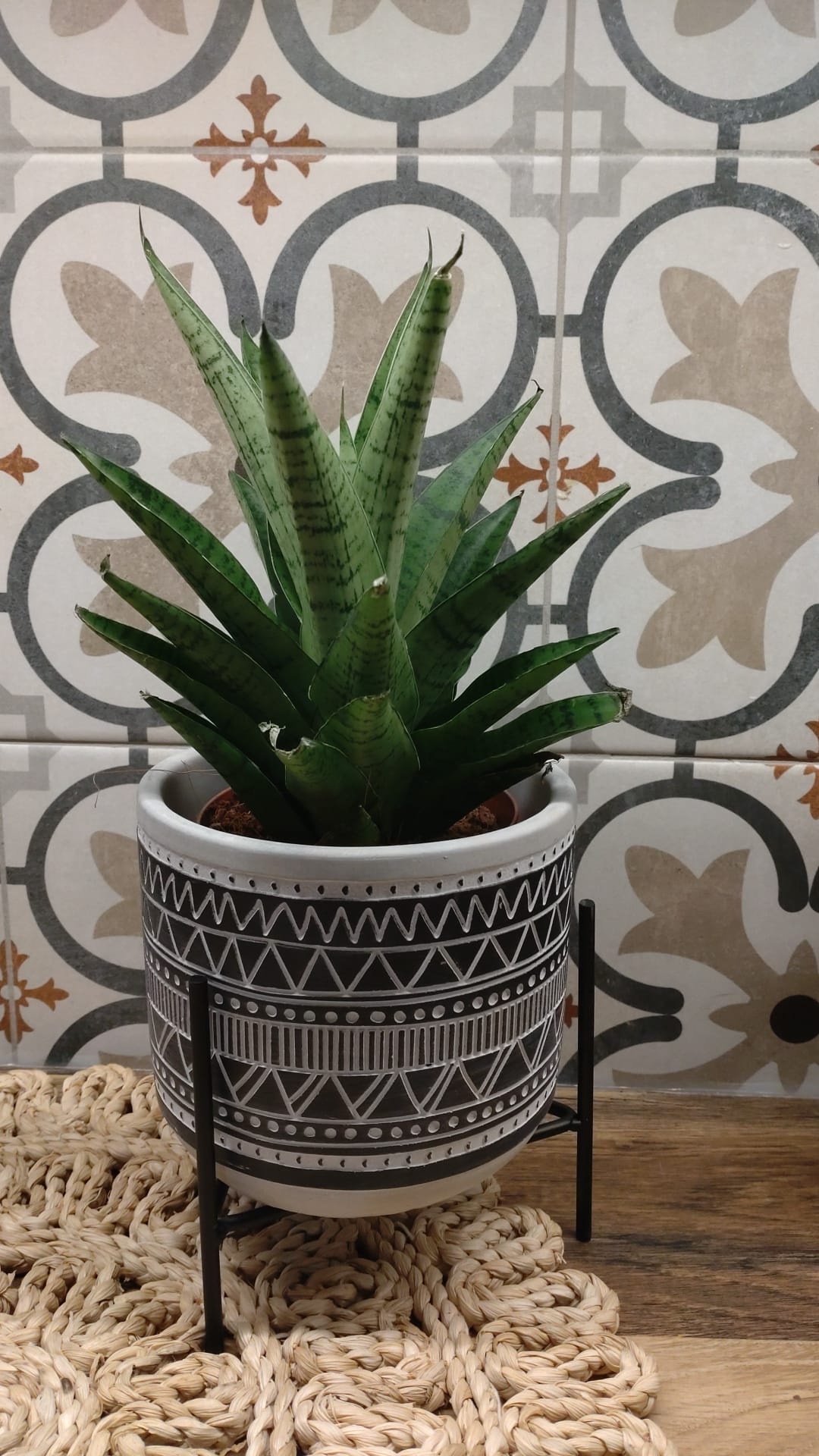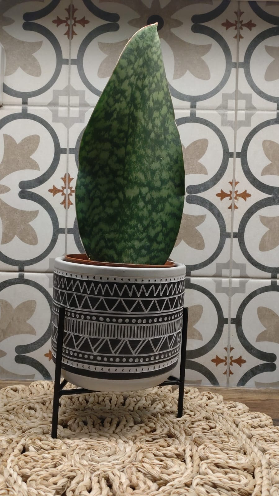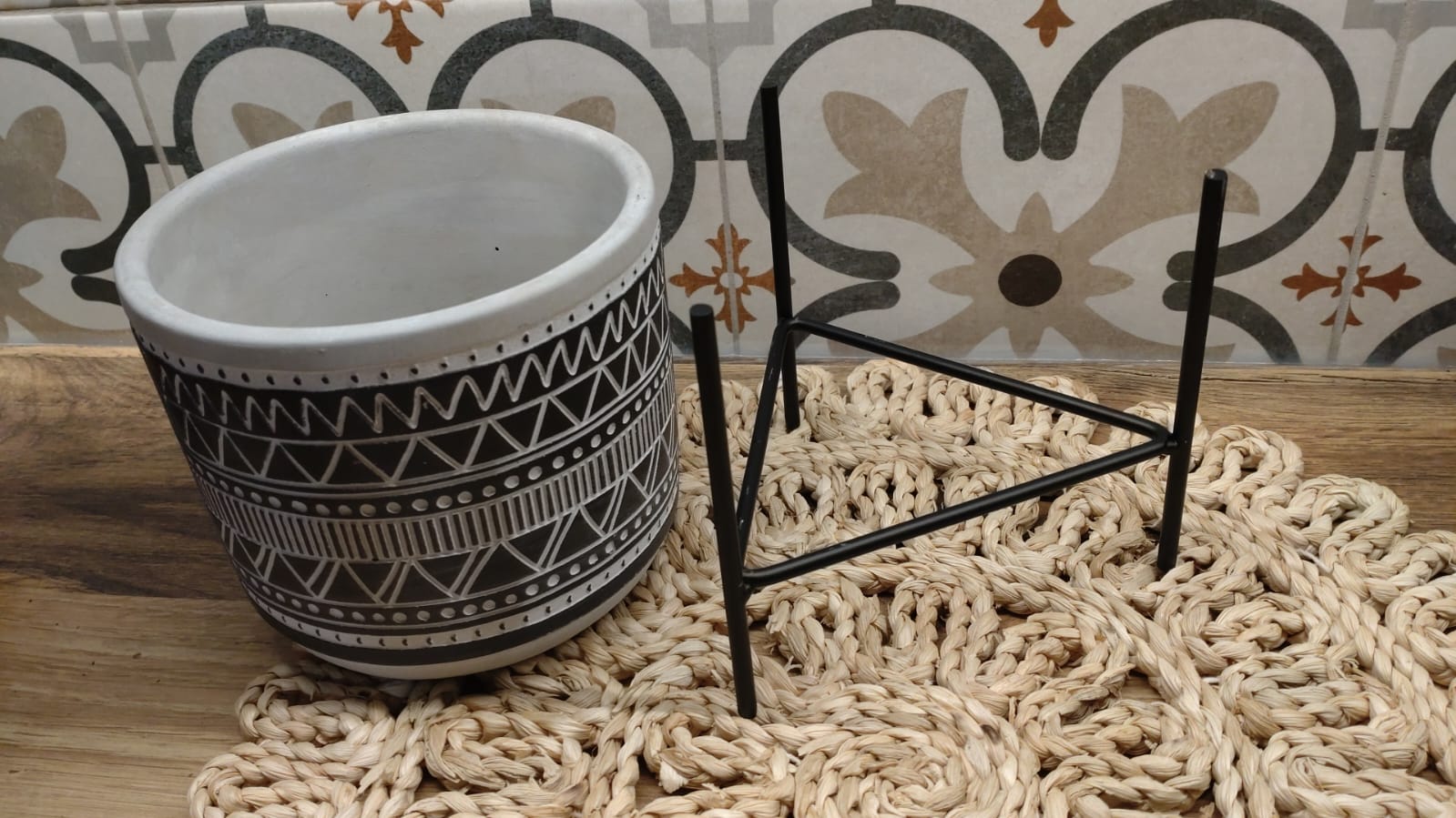 Hebe - betonový obal s antickým vzorem, na kovovém stojánku. Rozměr:14x12cm, velikost květináče: 12cm